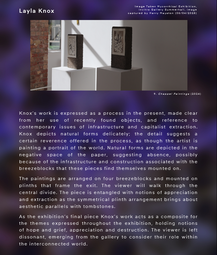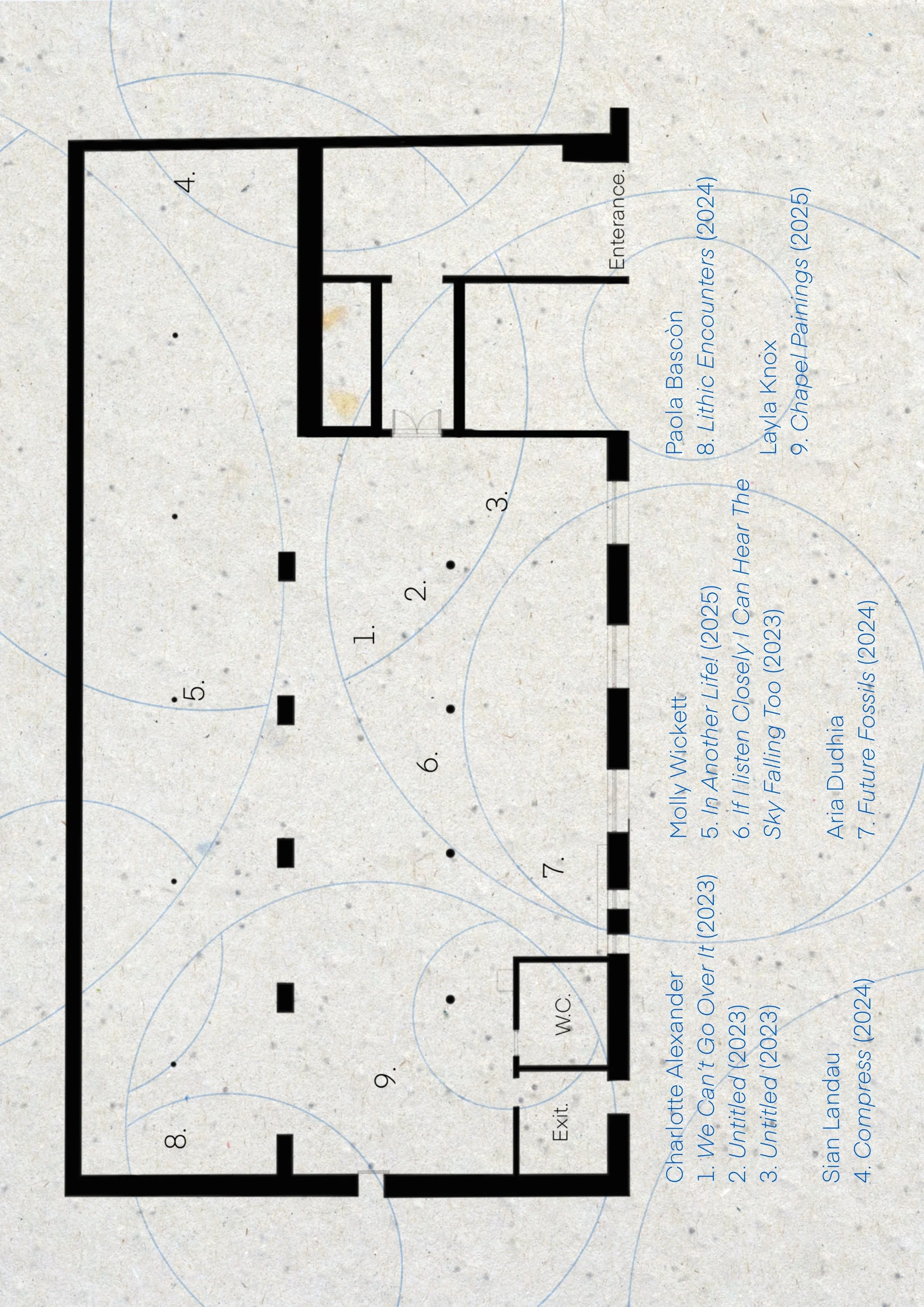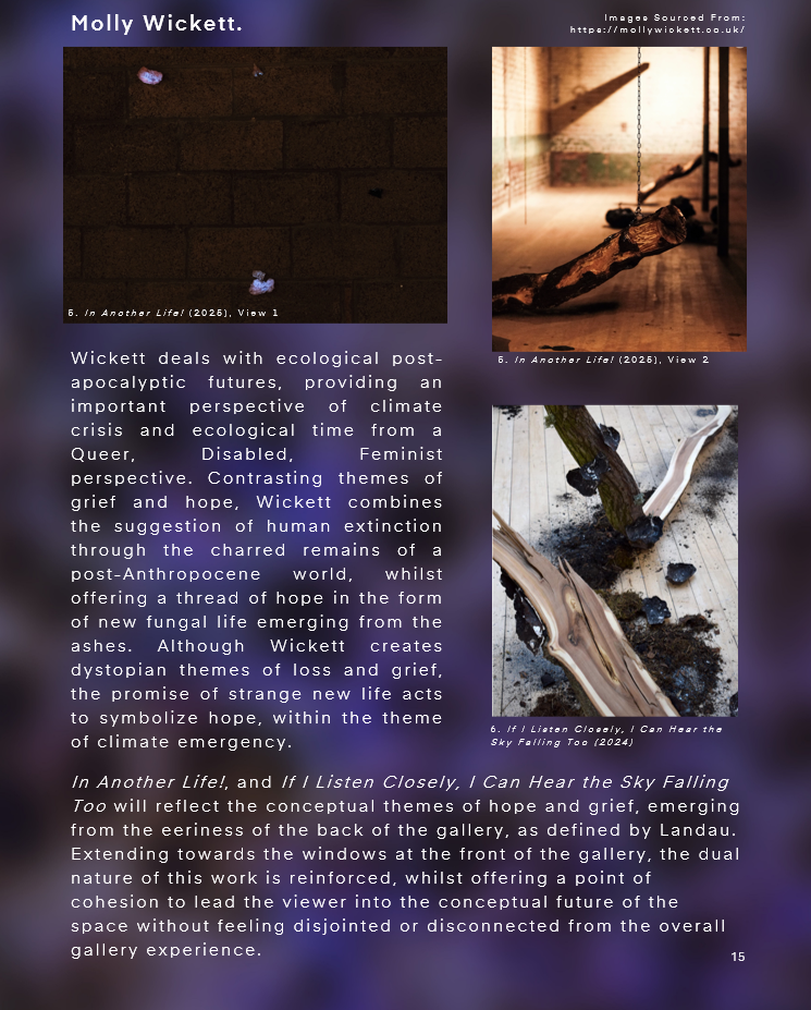 The artists are detailed in the order that they appear in the exhibition, and though a narrative has emerged, and networks of meaning have been analysed based on an anticipated path of audience engagement that progresses through the exhibition, the space is also left purposefully open to allow for visitors to explore in a self-constructed route, finding their own meanings as they progress. Additionally, though there is a heightened discussion about the meaning of artwork as a collective, the exhibited pieces are still intended to be represented as individual pieces with inherent value outside the context of the pieces that surround it.